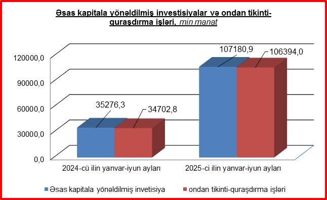 2025-ci ilin yanvar-iyun aylarında əsas kapitala 107180,9 min manat investisiya yönəldilmişdir ki, bu da 2024-cü ilin yanvar-iyun ayları ilə müqayisədə 3,0 dəfə çox olmuşdur. 2025-ci ilin yanvar-iyun aylarında əsas kapitala yönəldilmiş investisiyalardan tikinti-quraşdırma işləri 2024-cü ilin yanvar-iyun ayları ilə müqayisədə 3,1 dəfə artaraq 106394,0 min manat olmuşdur.