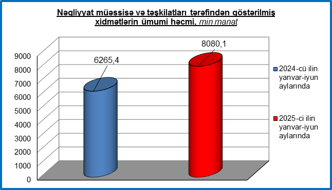 Nəqliyyat müəssisə və təşkilatlarında (fiziki şəxslər də daxil edilməklə) 2025-ci ilin yanvar-iyun aylarında göstərilmiş xidmətlərin dəyəri 2024-cü ilin yanvar-iyun aylarına nisbətən real ifadədə 26,2 faiz artaraq 8080,1 min manat olmuşdur. 2025-ci ilin yanvar-iyun aylarında göstərilmiş xidmətlərin ümumi həcminin 7997,8 min manatı və ya 99,0 faizi nəqliyyat müəssisə və təşkilatlarının (fiziki şəxslər də daxil edilməklə) əsas fəaliyyətindən yaranmışdır.