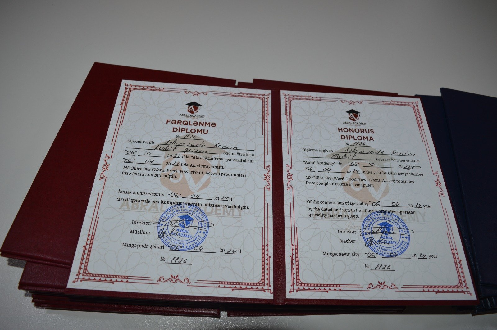 Akademyanın “Kompüter Operatorluğu İxtisası” üzrə təhsilini uğurla yekunlaşdıran tələbələr göstərdiyi yekun imtahan nəticələrinə uyğun diplomlarla təltif edildilər.