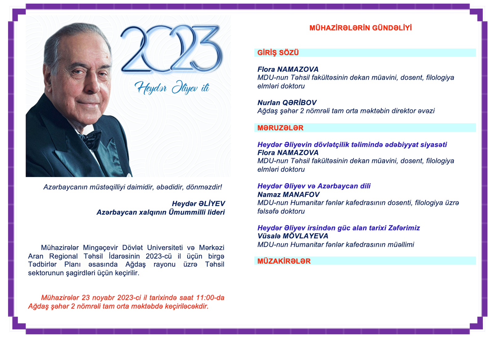 2023-cü il noyabrın 23-də Mingəçevir Dövlət Universiteti (MDU) və Mərkəzi Aran Regional Təhsil İdarəsinin (RTİ) birgə təşkilatçılığı ilə Ağdaş şəhər Nizami Gəncəvi adına 2 saylı tam orta məktəbdə “Heydər Əliyev müstəqil Azərbaycanın qurucusudur” mövzusunda mühazirə keçirilib. “Heydər Əliyev İli” çərçivəsində təşkil edilən mühazirədə məktəbin müəllim və şagird kollektivi üzvləri, MDU-nun bir qrup əməkdaşı iştirak edib.