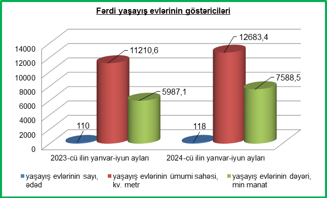 2024-cü ilin yanvar-iyun aylarında 118 fərdi yaşayış evi tikilib istifadəyə verilmişdir ki, bu da əvvəlki ilin müvafiq dövrü ilə müqayisədə 8 ev və ya 7,3 faiz çox olmuşdur. 2024-cü ilin yanvar-iyun aylarında istifadəyə verilmiş fərdi evlərin ümumi sahəsi 12683,4 kv. metr, yaşayış sahəsi isə 7355,6 kv. metr olmuşdur. 2023-cü ilin yanvar-iyun ayları ilə müqayisədə müvafiq olaraq fərdi evlərin ümumi sahəsi 13,1 faiz və ya 1472,8 kv. metr, yaşayış sahəsi isə 21,7 faiz və ya 1309,7 kv. metr çox olmuşdur. 2024-cü ilin yanvar-iyun aylarında istifadəyə verilmiş yaşayış evlərinin dəyəri 7588,5 min manat və ya əvvəlki ilin müvafiq dövrü ilə müqayisədə 1601,4 min manat və ya 26,7 faiz çox olmuşdur.