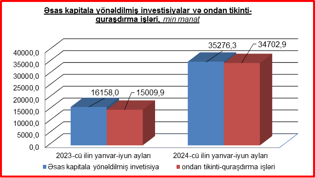 2024-cü ilin yanvar-iyun aylarında əsas kapitala yönəldilmiş investisiyalardan tikinti-quraşdırma işlərinə 34702,9 min manat investisiya qoyulmuşdur ki, bu da 2023-cü ilin yanvar-iyun ayları ilə müqayisədə 2,3 dəfə çox olmuşdur.