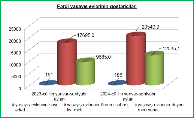 2024-cü ilin yanvar-sentyabr aylarında 186 fərdi yaşayış evi tikilib istifadəyə verilmişdir ki, bu da əvvəlki ilin müvafiq dövrü ilə müqayisədə 25 ev və ya 15,5 faiz çox olmuşdur. 2024-cü ilin yanvar-sentyabr aylarında istifadəyə verilmiş fərdi evlərin ümumi sahəsi 20549,9 kv. metr, yaşayış sahəsi isə 11675,3 kv. metr olmuşdur. 2023-cü ilin yanvar-sentyabr ayları ilə müqayisədə müvafiq olaraq fərdi evlərin ümumi sahəsi 16,1 faiz və ya 2854,9 kv. metr, yaşayış sahəsi isə 26,2 faiz və ya 2423,8 kv. metr çox olmuşdur. 2024-cü ilin yanvar-sentyabr aylarında istifadəyə verilmiş yaşayış evlərinin dəyəri 12535,4 min manat və ya əvvəlki ilin müvafiq dövrü ilə müqayisədə 2850,4 min manat və ya 29,4 faiz çox olmuşdur.