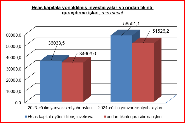 2024-cü ilin yanvar-sentyabr aylarında əsas kapitala yönəldilmiş investisiyalardan tikinti-quraşdırma işlərinə 51526,2 min manat investisiya qoyulmuşdur ki, bu da 2023-cü ilin yanvar-sentyabr ayları ilə müqayisədə 48,9 faiz çox olmuşdur.