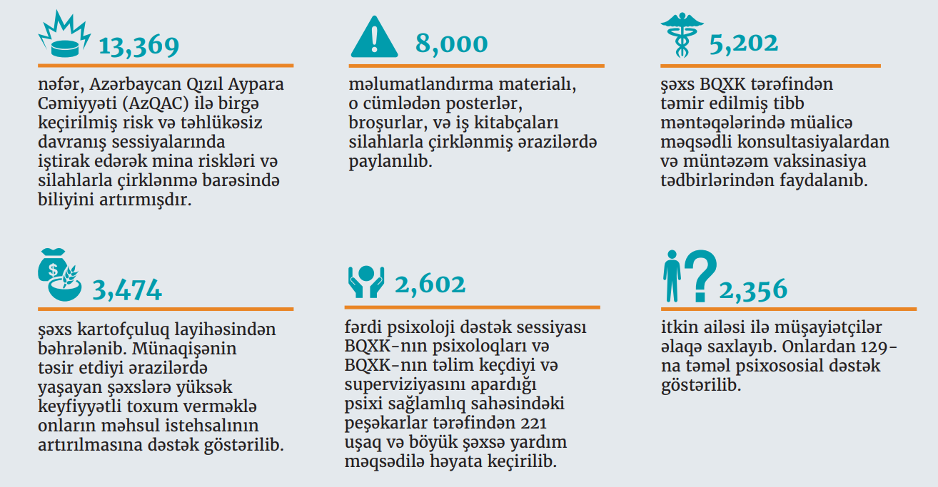 13,369 nəfər, Azərbaycan Qızıl Aypara Cəmiyyəti (AzQAC) ilə birgə keçirilmiş risk və təhlükəsiz davranış sessiyalarında iştirak edərək mina riskləri və silahlarla çirklənmə barəsində biliyini artırmışdır. Sessiyalar zamanı mövzuya dair 8,000 məlumatlandırma materialı, o cümlədən posterlər, broşurlar və iş kitabçaları paylanılıb.