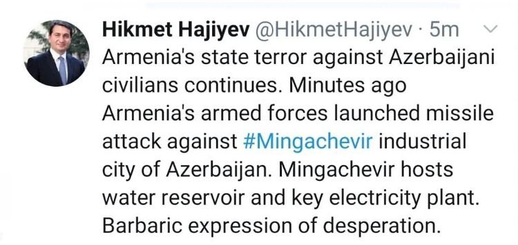Prezidentin köməkçisi qeyd edib ki, bir neçə dəqiqə əvvəl Ermənistan silahlı qüvvələri Azərbaycanın sənaye şəhəri olan Mingəçevirə raket zərbəsi endirib: “Mingəçevirdə Su anbarı və əsas elektrik stansiyası yerləşir. Bu, çarəsizliyin barbar ifadəsidir”.