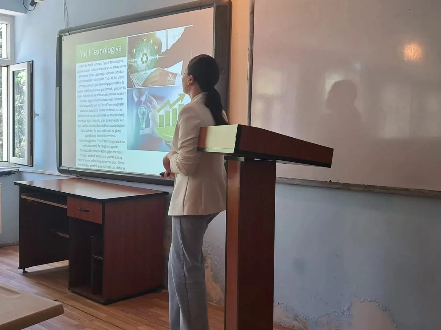 Sonra MDU tələbələridən Fidan Həşimova “Yaşıl texnologiya”, Zeynəb İsmayılova “COP29 nədir?”, Əfsanə Babayeva “Alternativ enerji mənbələri” və Arzu Hüseynova “Qlobal ekoloji problemlər” adlı mövzularla çıxış ediblər.