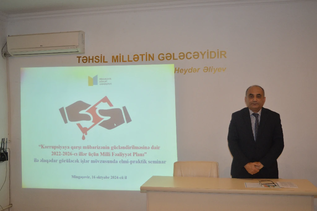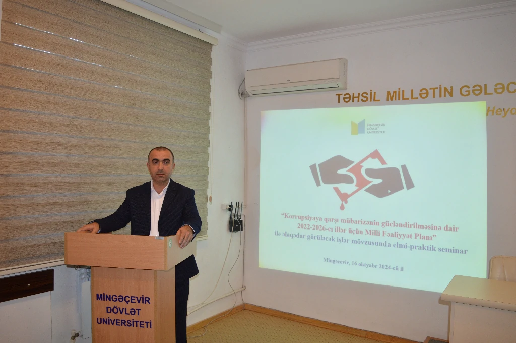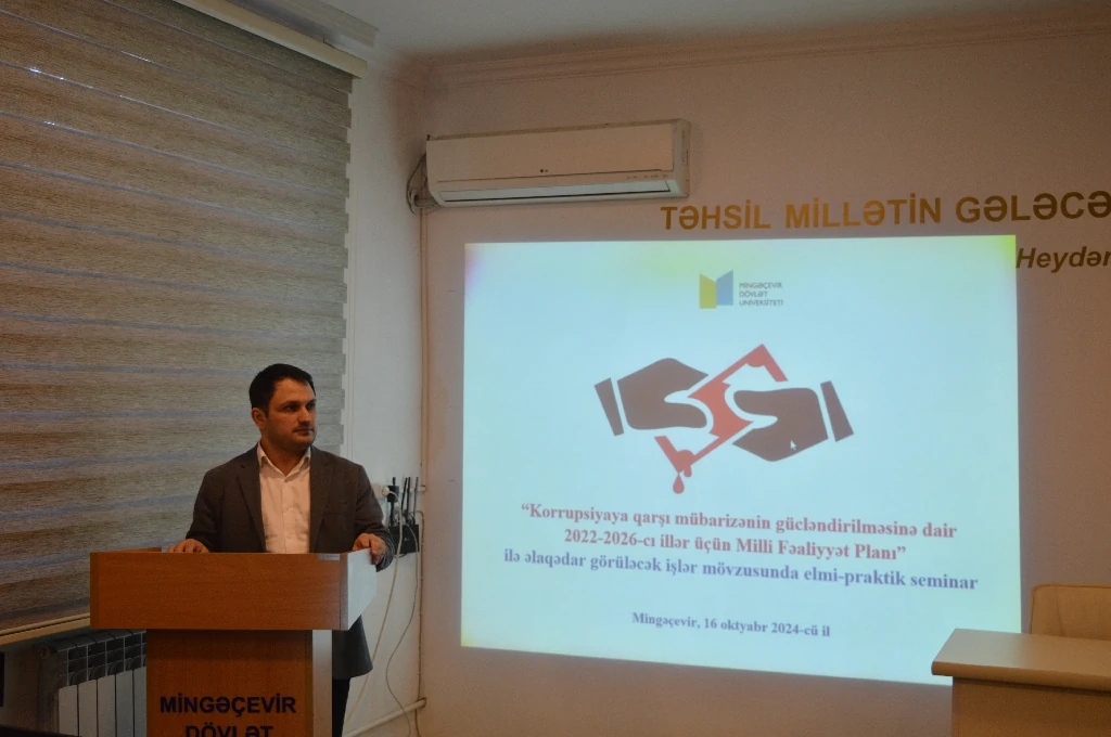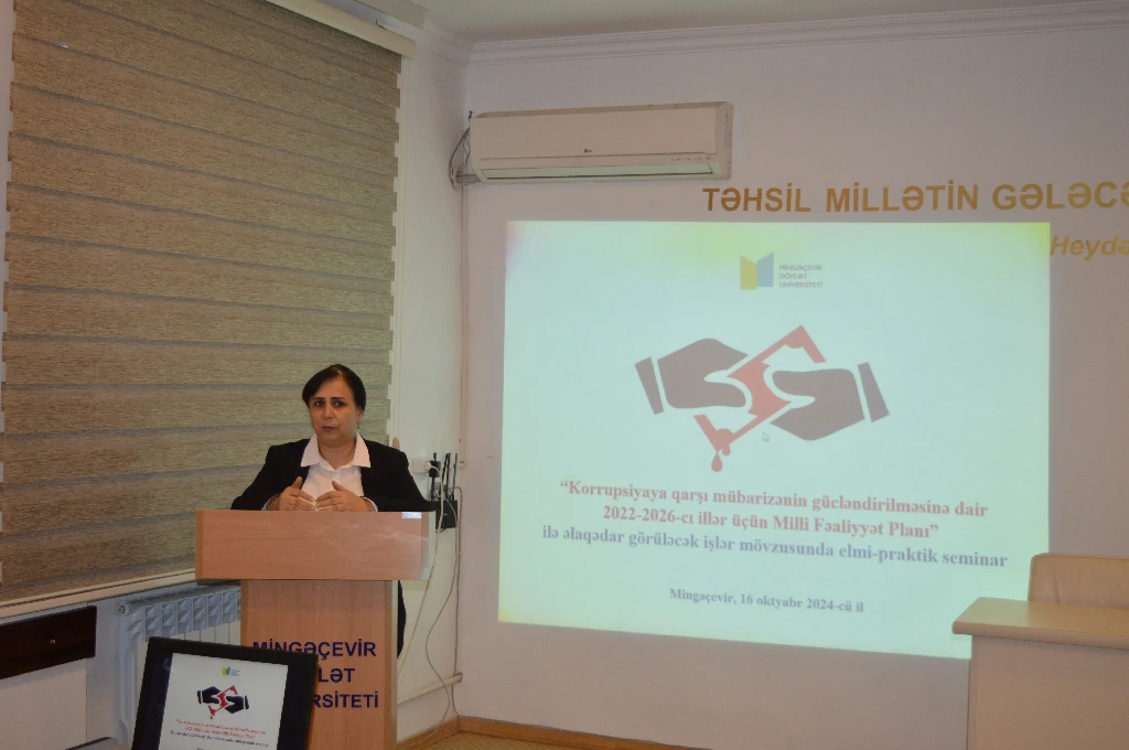 16 oktyabr 2024-cü il tarixində Mingəçevir Dövlət Universitetində (MDU) “Korrupsiyaya qarşı mübarizənin gücləndirilməsinə dair 2022-2026-cı illər üçün Milli Fəaliyyət Planı” çərçivəsində elmi-praktik seminar keçirilib. Tədbirdə korrupsiya ilə mübarizənin vacibliyi və bu sahədə maarifləndirmə işlərinin gücləndirilməsi məsələləri müzakirə olunub.
