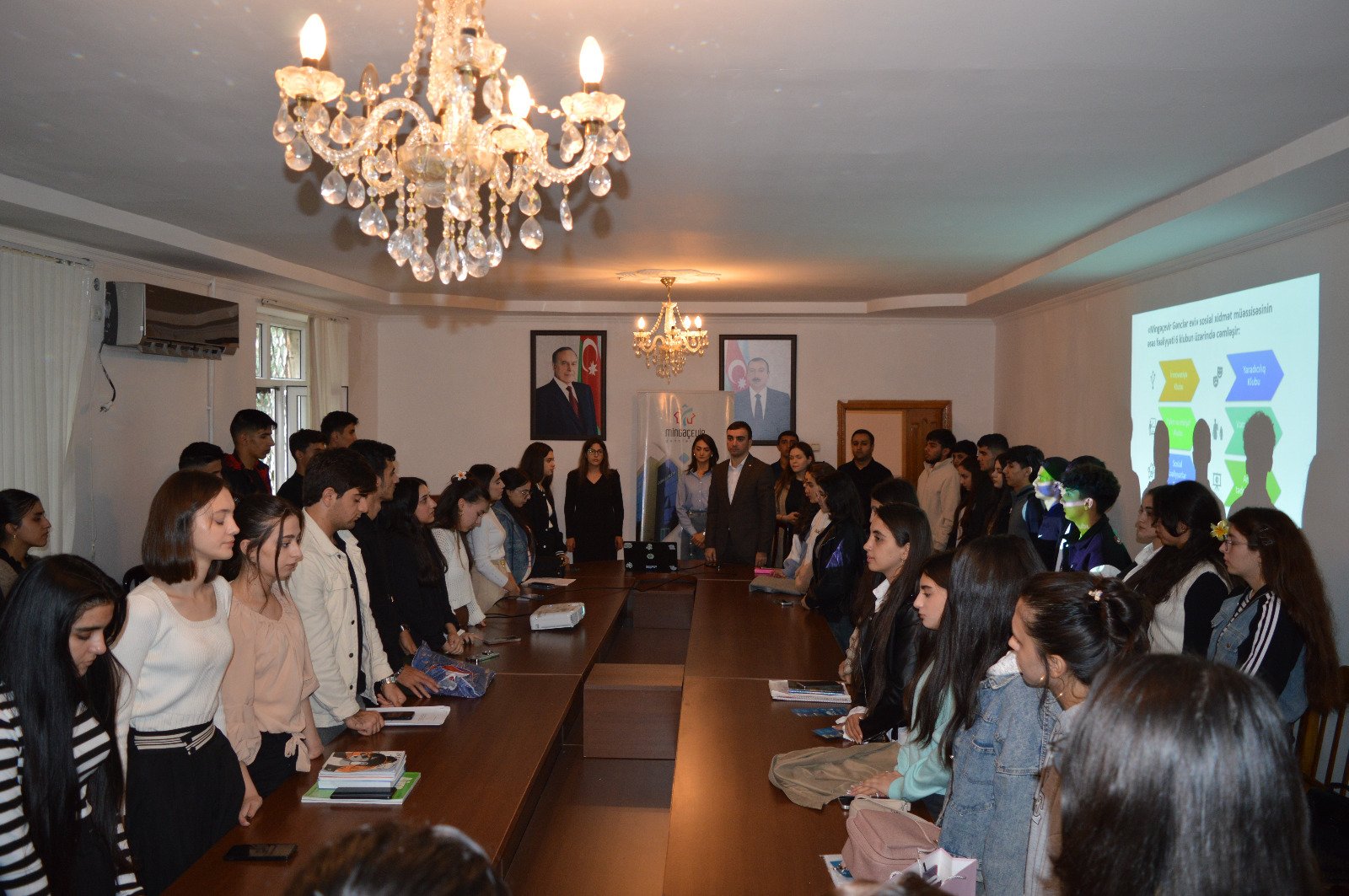Daha sonra Mingəçevir Gənclər Evinin direktor müavini Eşqin Bağırov və Dərnək Rəhbəri Humay Baxışova, həmçinin psixoloq Aynaz Quliyeva çıxış edərək, Gənclər Evinin struktur bölmələri haqqında geniş məlumat veriblər. Onlar gənclərin fərdi inkişafı üçün fəaliyyət göstərən dərnəklər, kurslar və sosial proqramların təqdim etdiyi imkanlardan söz açaraq, tələbələri bu proqramlara qoşulmağa və aktiv iştirakçı olmağa dəvət ediblər.