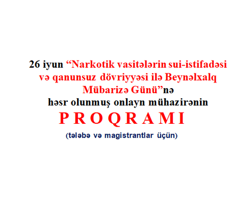 2022-ci ilin 23 iyun tarixində Mingəçevir Dövlət Universitetində (MDU) 26 İyun- “Narkotik vasitələrin sui-istifadəsi və qanunsuz dövriyyəsi ilə Beynəlxalq Mübarizə Günü”nə həsr olunmuş mühazirə keçirilib. “Microsoft Teams” platforması üzərindən onlayn formatda təşkil edilən mühazirədə MDU-nun akademik və inzibati heyət üzvləri, tələbələr və magistrantlar iştirak ediblər.