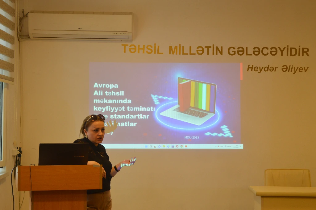 Təlimə rəhbərlik edən Keyfiyyət təminatı və davamlı inkişaf şöbəsinin baş mütəxəssisi Lamiyə İbrahimova, infosesiyada hərtərəfli məlumat təqdim edib. O, ilk növbədə keyfiyyət təminatı sisteminin universitetin tədris, idarəetmə və strateji fəaliyyətində oynadığı mühüm roldan bəhs edib. Lamiyə İbrahimova çıxışında keyfiyyət təminatının yalnız daxili yoxlama və nəzarət prosesi olmadığını, həm də davamlı inkişafı dəstəkləyən, universitetin təhsildə beynəlxalq standartlara uyğunlaşmasını təmin edən mühüm bir vasitə olduğunu vurğulayıb.