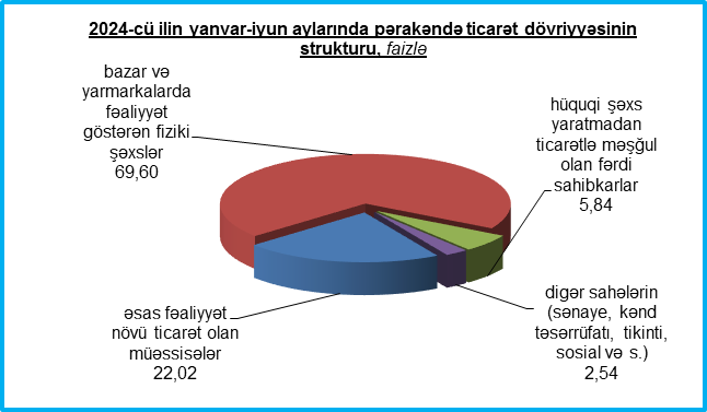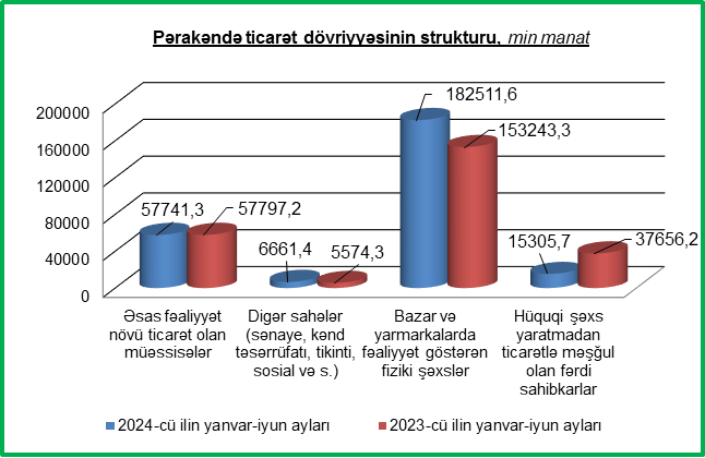 2024-cü ilin yanvar-iyun aylarında pərakəndə ticarət şəbəkələrində istehlak malları satışının 73,6 faizi və ya 192954,9 min manatı ərzaq məhsulları, içkilər və tütün məmulatları, 26,4 faizi və ya 69265,1 min manatı isə qeyri-ərzaq mallarının payına düşmüşdür. 2024-cü ilin yanvar-iyun aylarında əsas fəaliyyəti pərakəndə ticarət olan şəbəkələrdən 57741,3 min manatlıq əmtəə satılmışdır ki, bu da keçən ildən 55,9 min manat və ya 0,1 faiz az olmuşdur. Digər sahələr (sənaye, kənd təsərrüfatı, tikinti, sosial və s.) üzrə satışın məbləği 6661,4 min manat təşkil etmişdir ki, bu da 2023-cü ilin müvafiq dövrü ilə müqayisədə 19,5 faiz və ya 1087,1 min manat çox olmuşdur. Bazar və yarmarkalarda fəaliyyət göstərən fərdi sahibkarlar tərəfindən satılmış malların məbləği 182511,6 min manat təşkil etmişdir ki, bu da 2023-cü ilin yanvar-iyun aylarına nisbətən 19,1 faiz və ya 29268,3 min manat çox olmuşdur. Hüquqi şəxs yaratmadan ticarətlə məşğul olan fərdi sahibkarlar tərəfindən satılmış malların məbləği isə 15305,7 min manat təşkil etmişdir ki, bu da keçən ilə nisbətən 59,4 faiz və ya 22350,5 min manat az olmuşdur.
