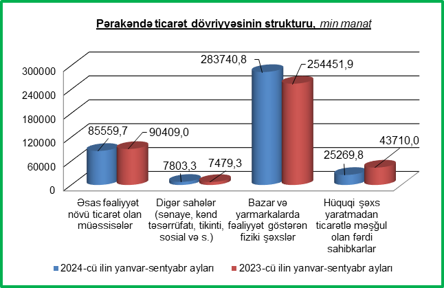 2024-cü ilin yanvar-sentyabr aylarında hüquqi şəxslər üzrə pərakəndə ticarət dövriyyəsinin 0,14 faizi dövlət və 99,86 faizi isə qeyri-dövlət müəssisələrinin payına düşmüşdürərrüfatı, tikinti, sosial və s.) üzrə satışın məbləği 7803,3 min manat olmuşdur. Fərdi sahibkarlar, bazar və yarmarkalar üzrə satılmış malların məbləği 309010,6 min manat təşkil etmişdir ki, bu da 2023-cü ilin müvafiq dövrü ilə müqayisədə 2,8 faiz çox olmuşdur.