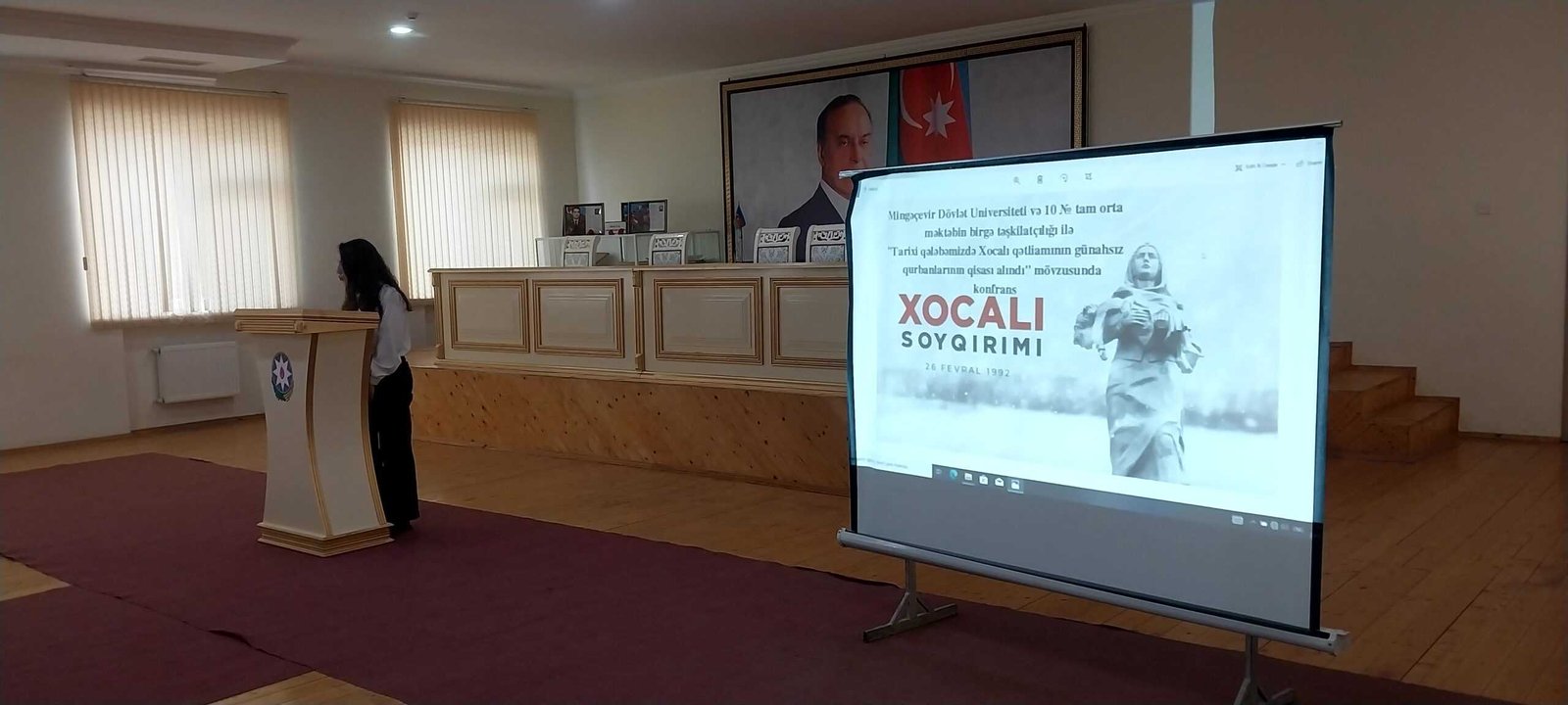 2023-cü ilin fevralın 24-də Mingəçevir Dövlət Universitetinin (MDU) Təhsil fakültəsinin və Mingəçevir şəhər 10 saylı tam orta məktəbin təşkilatçılığı ilə 26 Fevral- Xocalı Soyqırımı Gününə həsr olunmuş “Tarixi qələbəmizlə Xocalı qətliamının günahsız qurbanlarının qisası alındı” mövzusunda konfrans keçirilib.