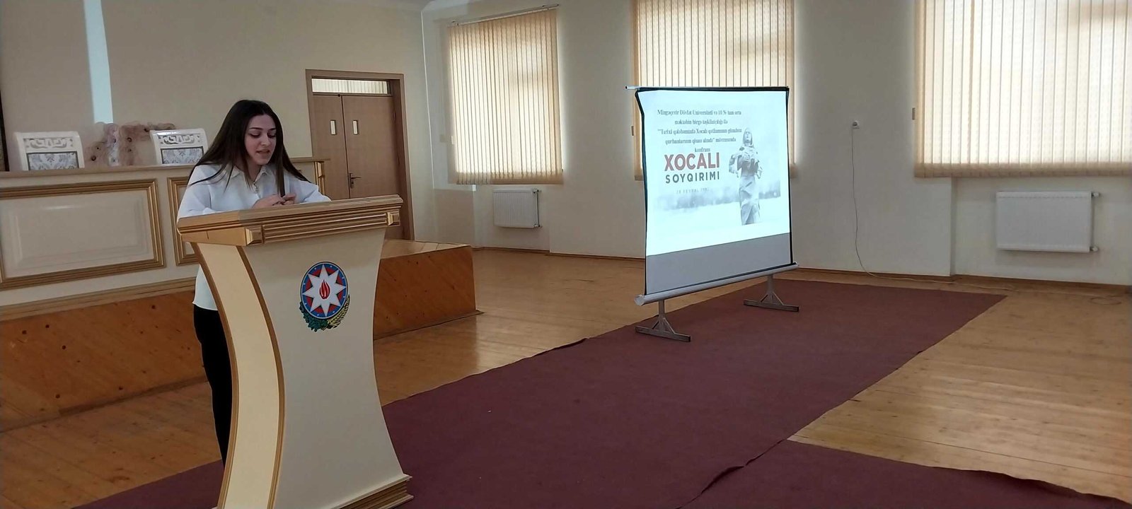 Sonra MDU tələbələrinin təqdimatında “Xocalı soyqırımına aparan yola siyasi-tarixi baxış”, “Xocalı soyqırımı 20-ci əsrin ən dəhşətli faciələrindəndir”, “Xocalı soyqırımının hüquqi təhlili”, “Xocalı faciəsi dünyanın gözü ilə”, “Ümummilli lider Heydər Əliyev tərəfindən Xocalı soyqırımına siyasi qiymətin verilməsi” və “Tarixi qələbəmizlə Xocalı qətliamının günahsız qurbanlarının qisası alındı” mövzularında məruzələr dinlənilib.